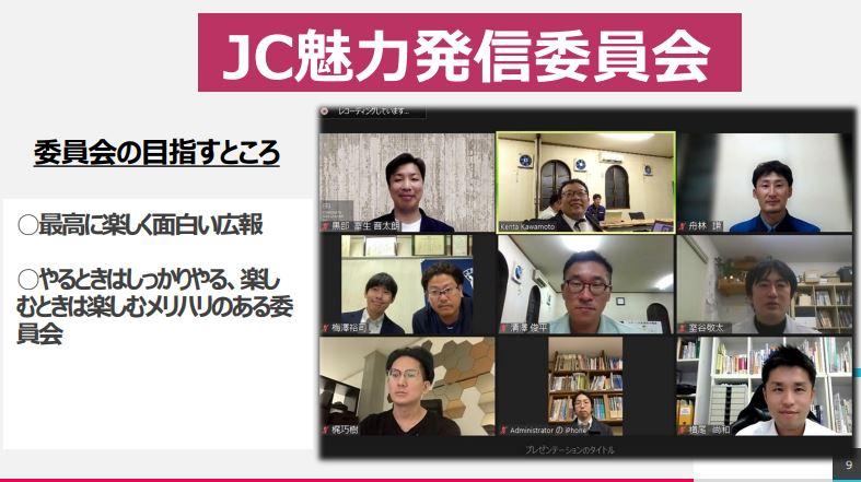 第4弾となる今回は、公益社団法人日本青年会議所 2022年度 社会グループ ビジョナリーシティ会議です。ビジョナリーシティ会議には、VCの河本 拓也君をはじめ、小幹事の小杉 知弘君、委員として平木 柳太郎君、坂本 美沙紀君、私の計5名が出向しています。