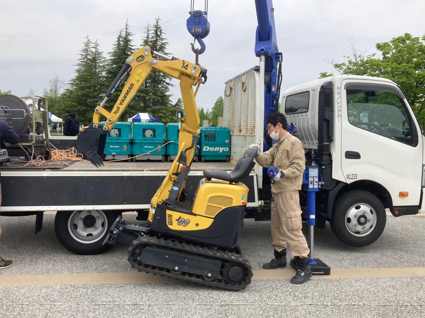 会場へ到着して、台車とユニックからバックホウとローラー、もろもろの備品を降ろします。ユニックで荷物を吊って降ろす作業はソネさんがクレーンを操作して行ってくれました。