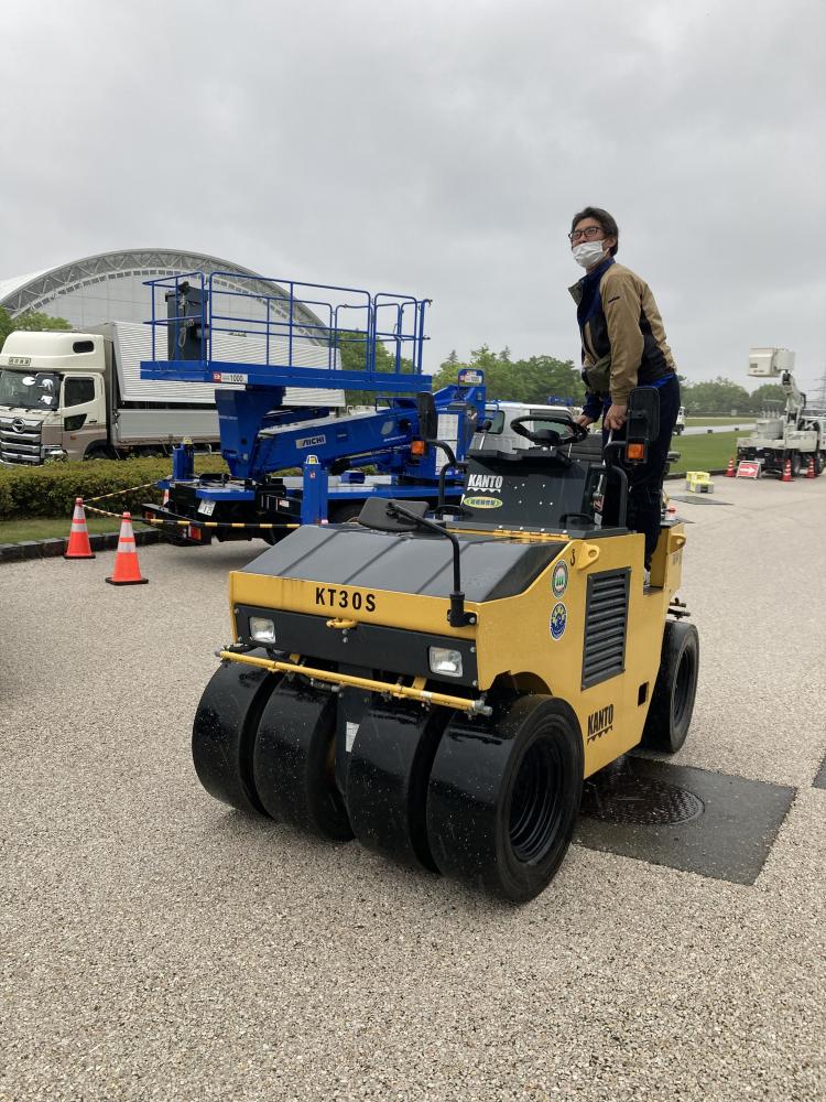 私の仰せつかった任務は、車両の運搬、展示車両の配置誘導、そして建設機械の展示ブースで対応をすることでした。実は私これでも建設業に勤めておりまして、バックホウやタイヤショベル、ローラー等の建設機械は動かすことができます!職人レベルではありませんが・・・そのこともあり当初はバックホウの操作を体験してもらうとの案もありましたが、安全性の面を考慮して展示して試乗だけになりました。