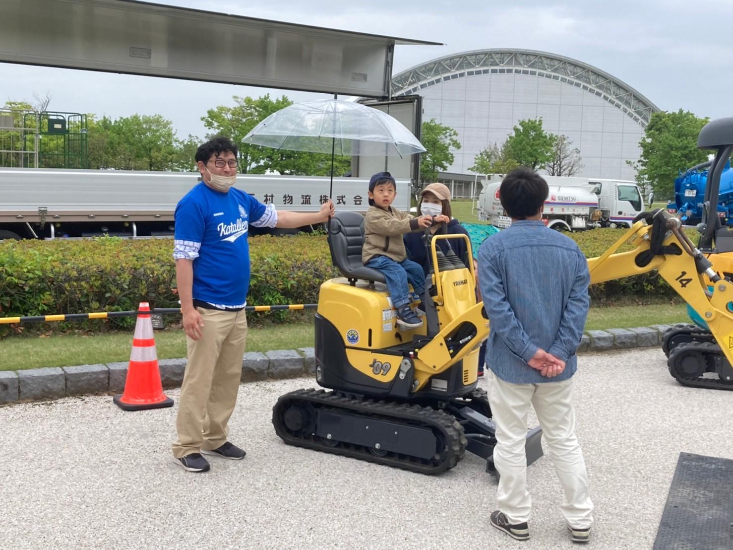 準備が終わると、GW初日とのこともあり公園に遊びに来ていた親子がイベントの匂いを嗅ぎつけて集まり始めました。私たちの他にも飲食ブースが有りましたが、建設機械やいろいろな「はたらくくるま」がずらりと並んでいると、特に子供が興味を持って吸い寄せられてきます。浅井副理事長が「はたらくくるま」のイベントは子供に人気が有り人が結構来ると言っていた意味がわかりました。