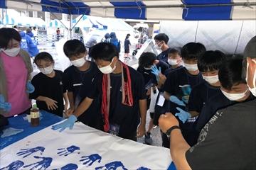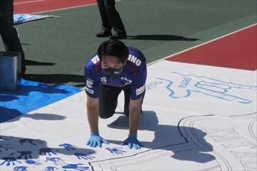 応援フラッグに手形を押す針田理事長
